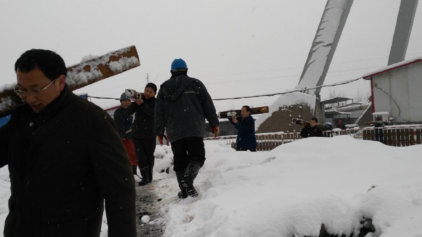24日下午14:40中煤五建31处(临时)主井提升机车房积雪过多且服务时间较长房顶被压塌,造成车房钢结构、彩钢瓦直接压塌在提升机滚筒上,导致提升机无法运行。由于31处大部分职工被困井下,现场环境较恶劣救援任务开展不畅。"雪情就是命令,灾情连着亲情",为保障井下员工弟兄们尽快安全升井及恢复快速现场,时间不等人,分公司经理时圣国同志命令现场启动应急预案部署救援、抗雪防灾工作,兵分两路组织分公司全体人员:主要兵力通过紧急救援方案(措施)绞车房打设木垛、焊接结构支撑及加固彩钢瓦房顶等工作,经过紧张有序抢修,20:40主井提升机迅速恢复正常运行,井下人员安全生井。其他人员进行除雪、除冰、防冻和防滑工作及排查井口安全防护设施、井筒设备安全使用情况。