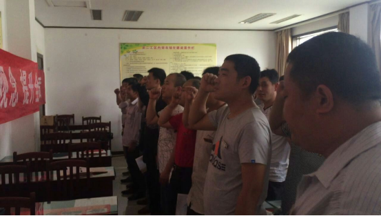 安全月活动之际,6月5日下午,鹿洼煤矿采二工区全体职工在工区会议室进行"强化安全发展观念,提升全民安全素质"条幅个人签名活动并在条幅下进行集体宣誓:"热爱本职工作,坚持标准作业,杜绝违章违纪…"